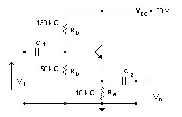 1. Perform an analysis of the circuit below (draw the equivanent circuit for frequencies where the capacitors can be ignored and calculate the input and output impedances and the voltage gain) and then find a value for the emitter resistor to make the DC collector current 1.2mA