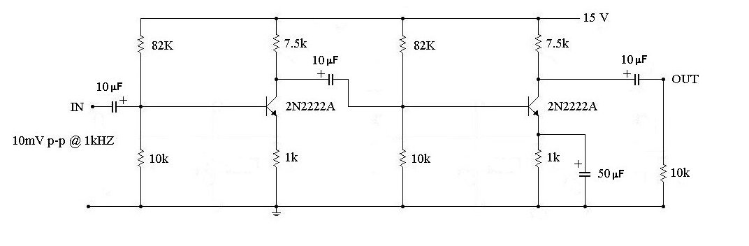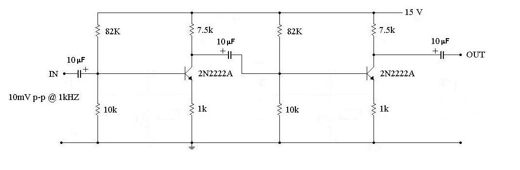 3. Now measure the output signal level at the collector of the second transistor and calculate both the second stage gain and the overall gain of your 2-stage amplifier